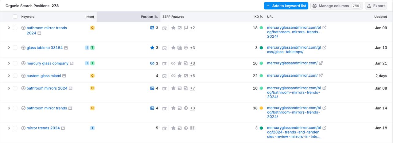 Optimized existing content with high-performing local keywords, such as “mirror cut to size near me” and “glass partitions Miami.”.