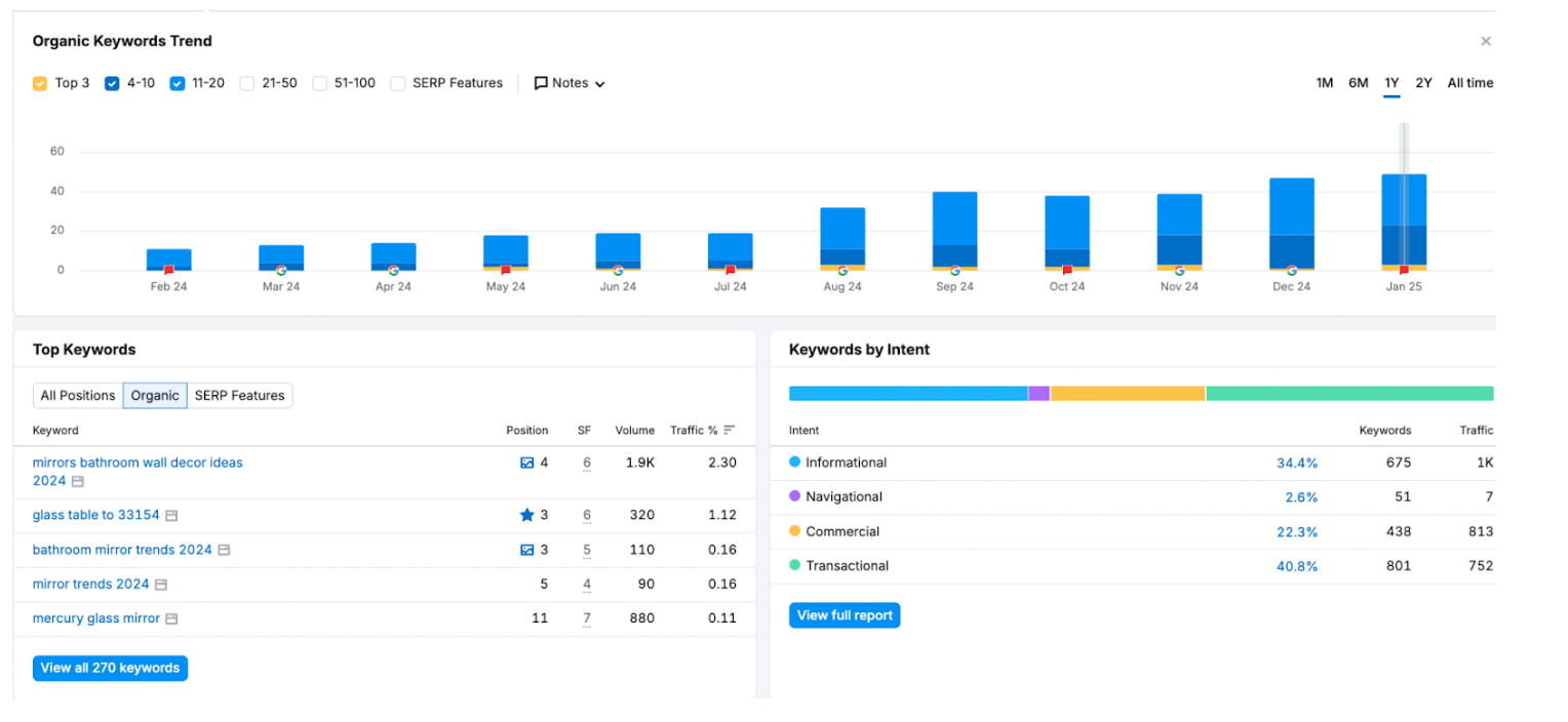 Created engaging blog content, featuring trending topics, like “Bathroom Mirrors Trends in 2025,” to capture audience interest and increase keyword coverage.